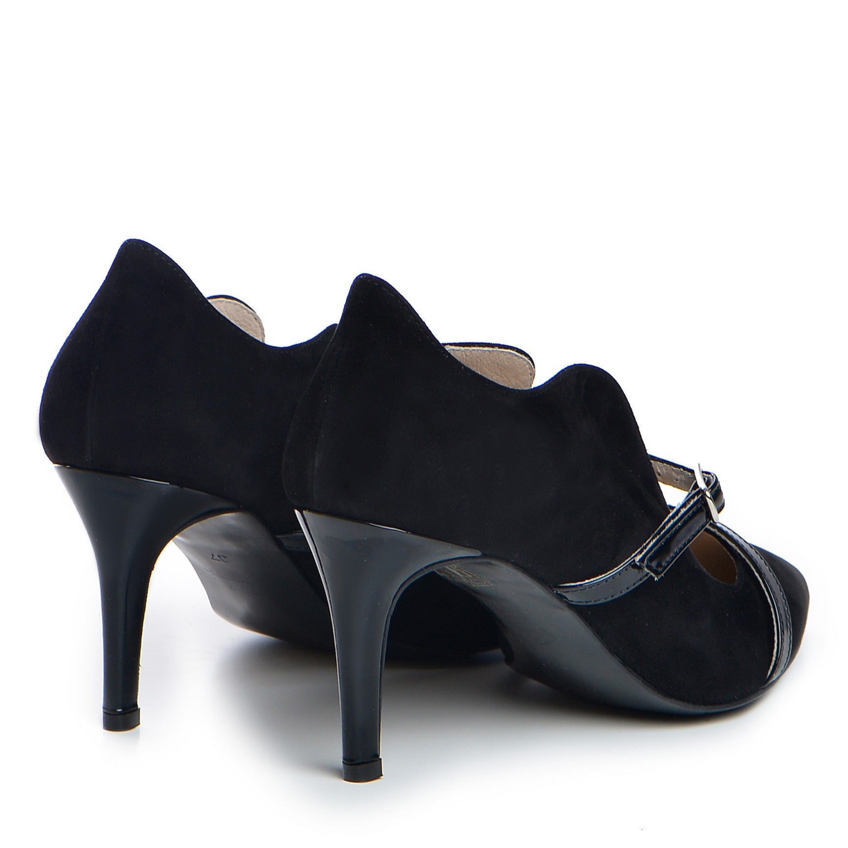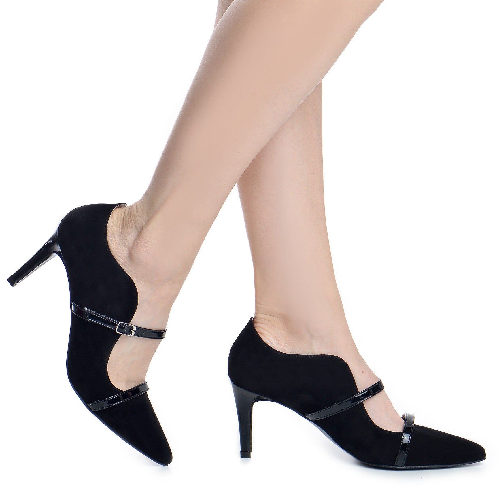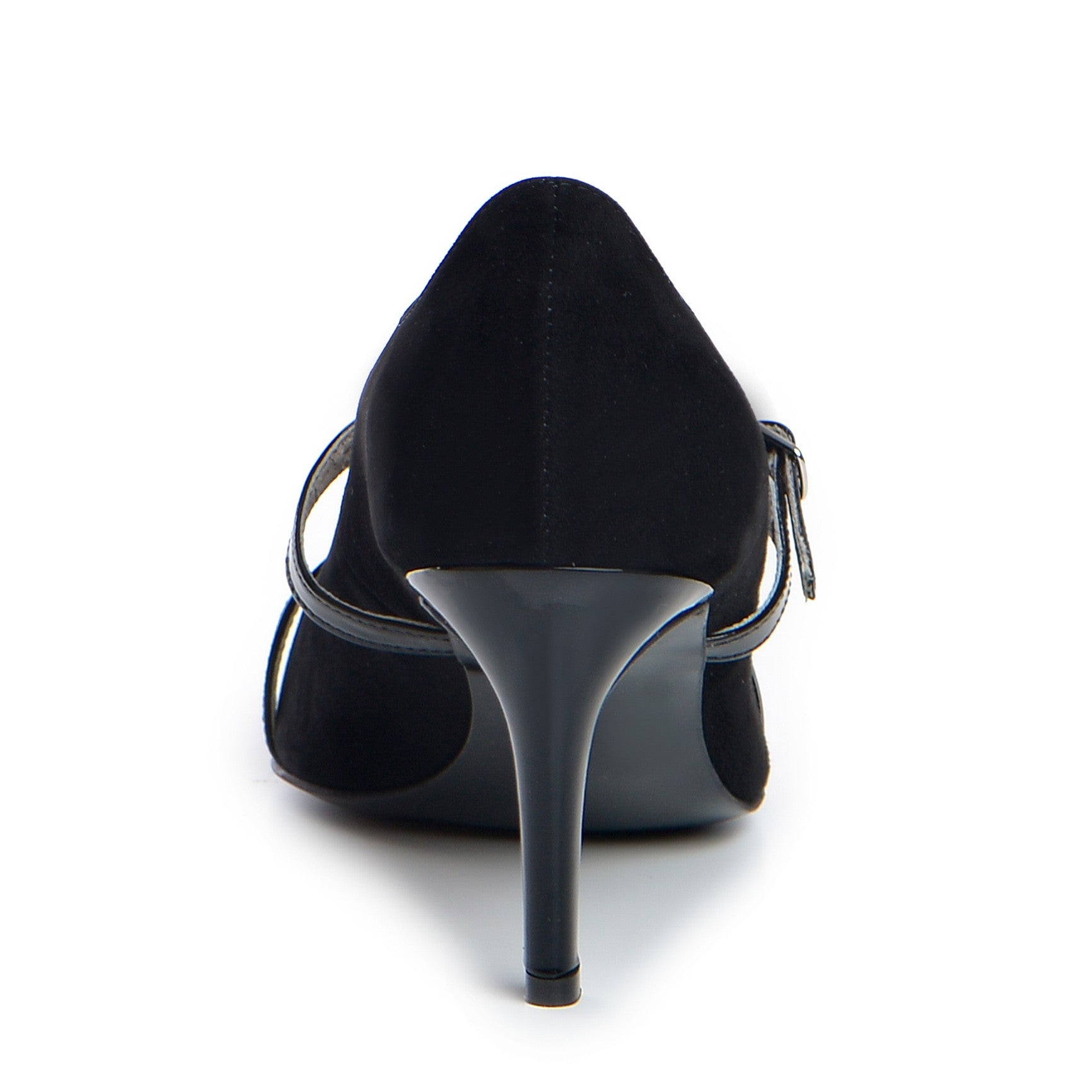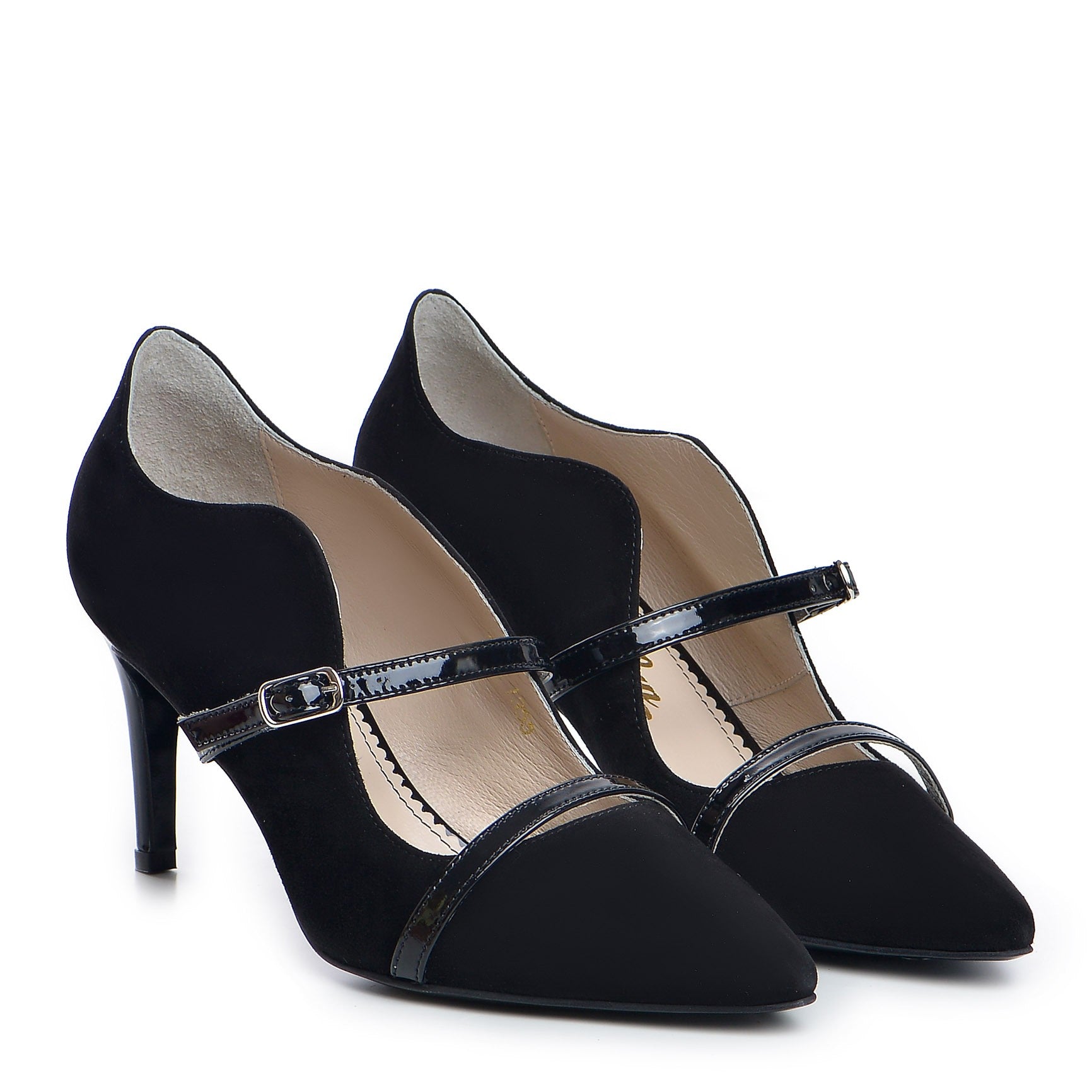 Pantofi de dama stiletto confectionati din piele naturala velur negru combinat cu lac negru.