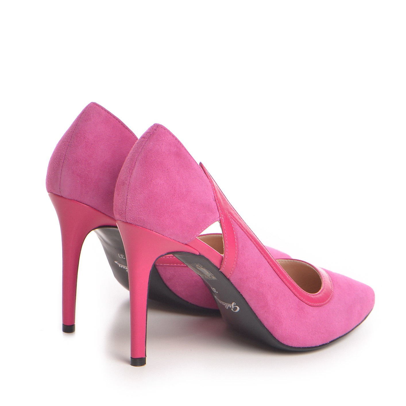 Pantofi dama decupati lateral confectionati din piele naturala velur fuxia combinat cu nappa magenta.